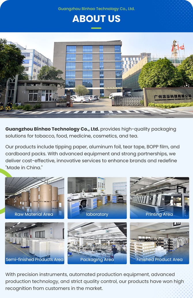 BINHAO is your one-stop manufacturer for tobacco packaging materials, offering high-quality aluminum foil paper, tipping paper, cigarette cardboard boxes, tear strip tape, BOPP/PVC transparent film, inner frame paper, and more.